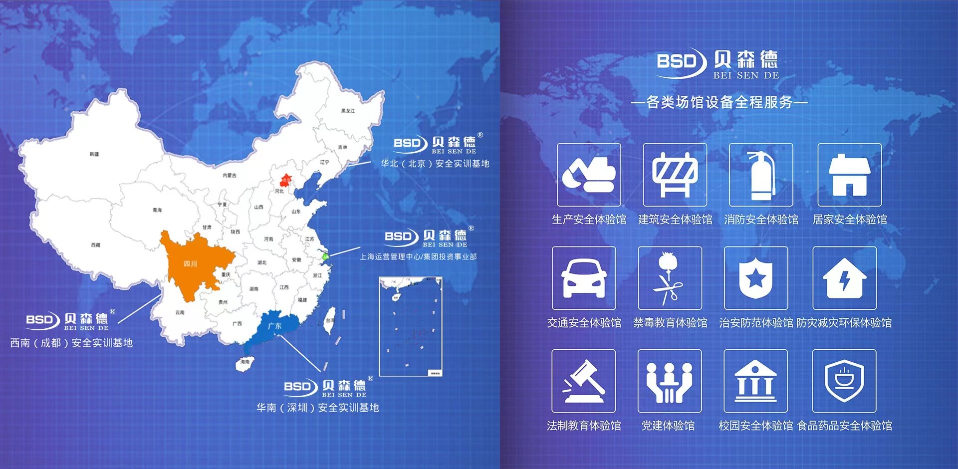 貝森德旗下有:貝森德、貝創(chuàng)科技、瓦令科技等品牌,主營(yíng)業(yè)務(wù)由:體驗(yàn)式教育服務(wù)、綠色環(huán)保服務(wù)等構(gòu)成。 提供各類(lèi)場(chǎng)館設(shè)備全程服務(wù):消防體驗(yàn)館、消防安全體驗(yàn)館、生產(chǎn)安全體驗(yàn)館、建筑安全體驗(yàn)館、居家安全體驗(yàn)館、交通安全體驗(yàn)館、工地安全體驗(yàn)館、VR安全體驗(yàn)館、校園安全體驗(yàn)館、食品藥品安全體驗(yàn)館、安全教育體驗(yàn)館、禁毒體驗(yàn)館、禁毒教育體驗(yàn)館、治安防范體驗(yàn)館、防災(zāi)減災(zāi)體驗(yàn)館、法制教育體驗(yàn)館、黨建體驗(yàn)館、模擬滅火體驗(yàn)、安全體驗(yàn)教室等。業(yè)務(wù)覆蓋全國(guó),主要覆蓋上海、北京、深圳、四川成都、浙江、江蘇、云南等地。